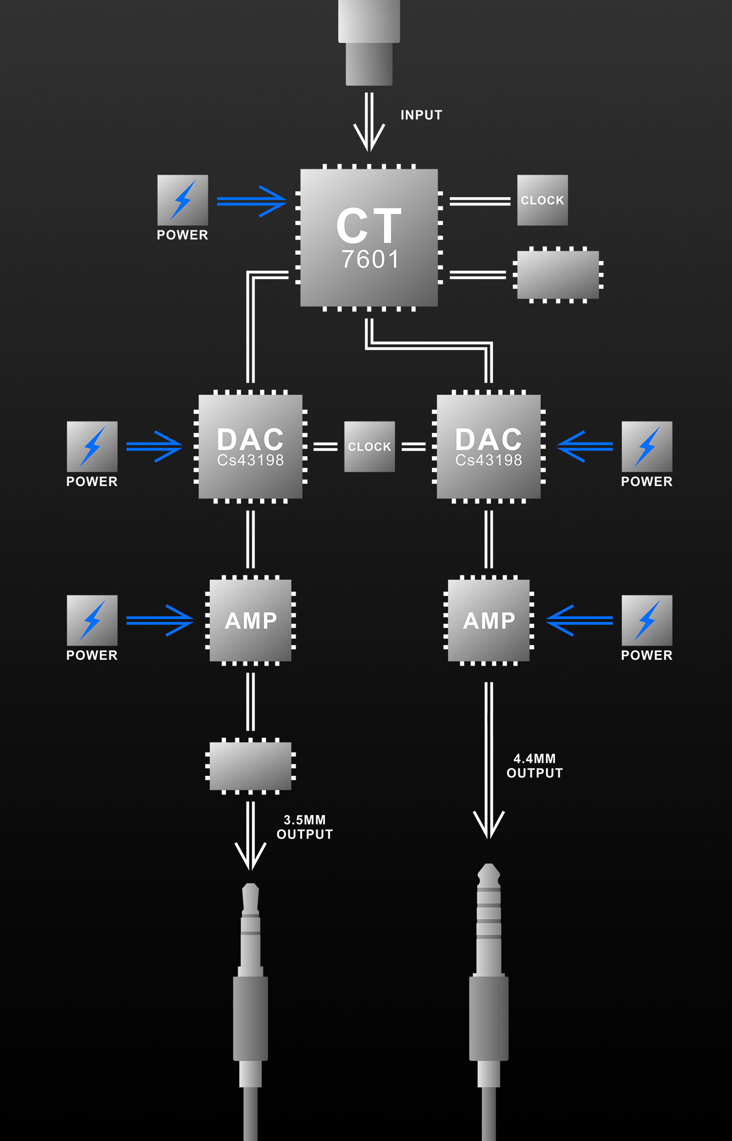 超大電流輸出,獨立供電架構採用獨立供電架構,搭載超低噪聲正負電源設計與低壓差線性穩壓技術,確保電流輸出穩定且高精度,內部亦設有高低增益調節,提供最高4 Vrms的強大輸出功率,能輕鬆驅動從低阻抗到高阻抗的耳機,實現強大推力與低噪聲輸出。 | ![]() |
