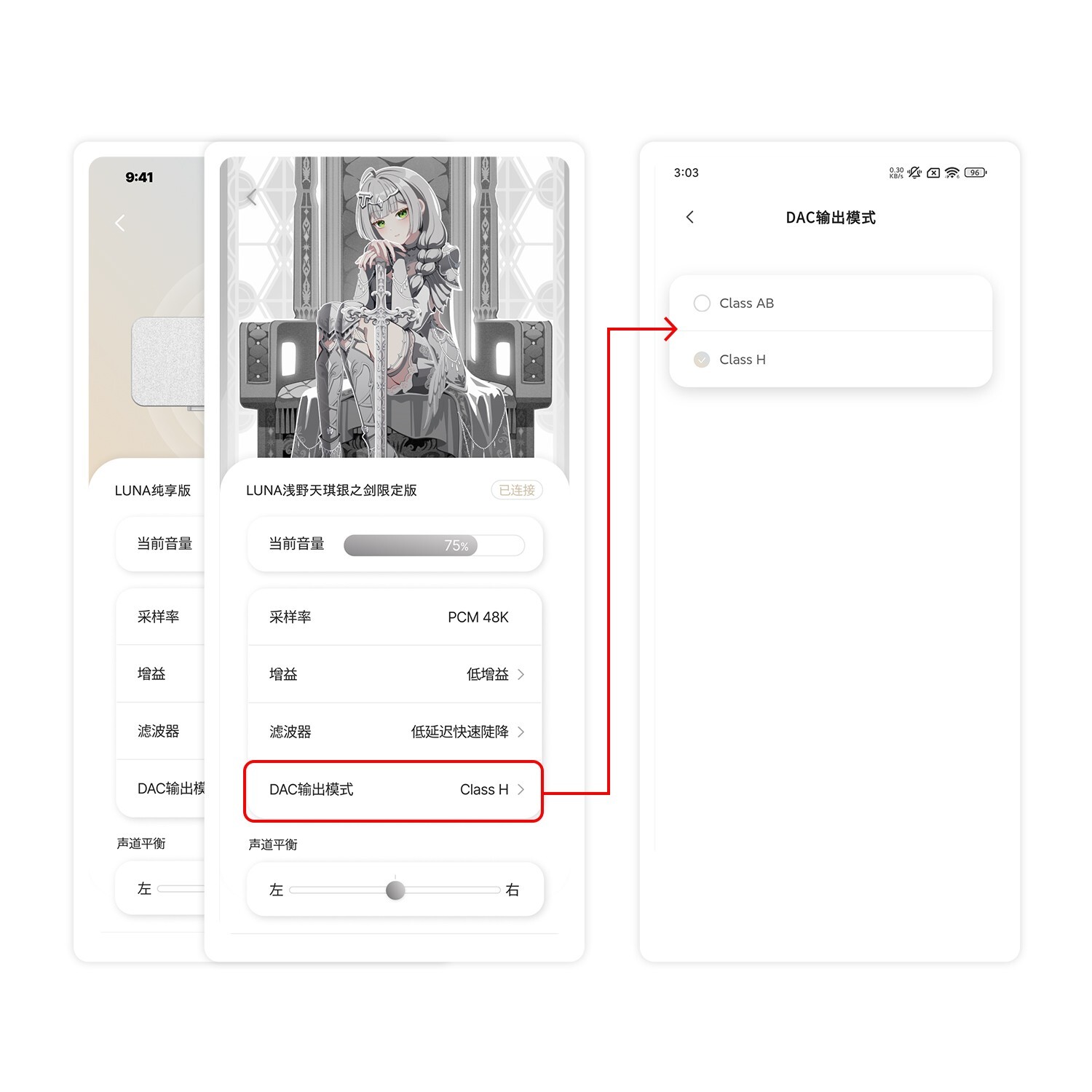 DAC輸出級的工作模式可以設置到AB類和H類。Class AB放大器以其優秀的線性特性和穩定性在高保真音頻領域中有廣泛應用,LUNA默認Class AB設置,而Class H放大器則有相對較高的工作效率。