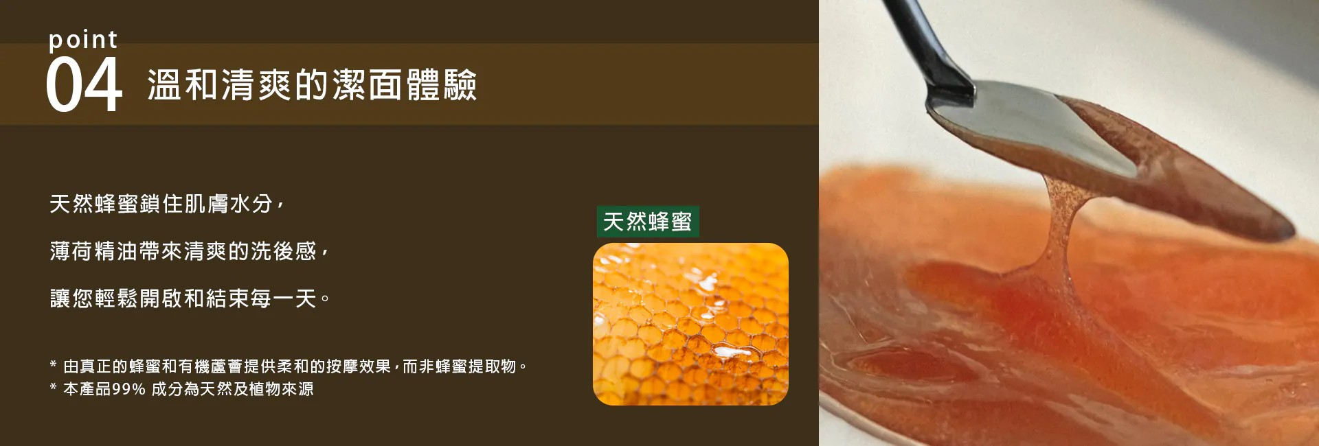 ➀ 100%天然蜂蜜與蜂膠:打造柔滑凝膠質地,潔膚同時兼具舒緩按摩效果。