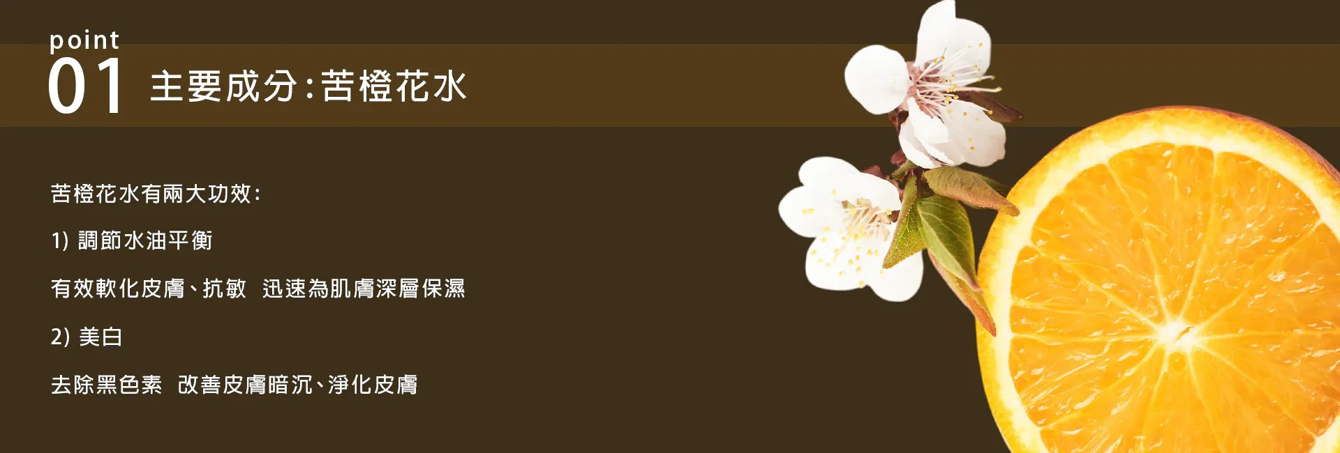 ➀ 以苦橙花水為首要成分:溫和舒緩敏感與問題肌膚,同時細緻毛孔,展現柔嫩新膚質。