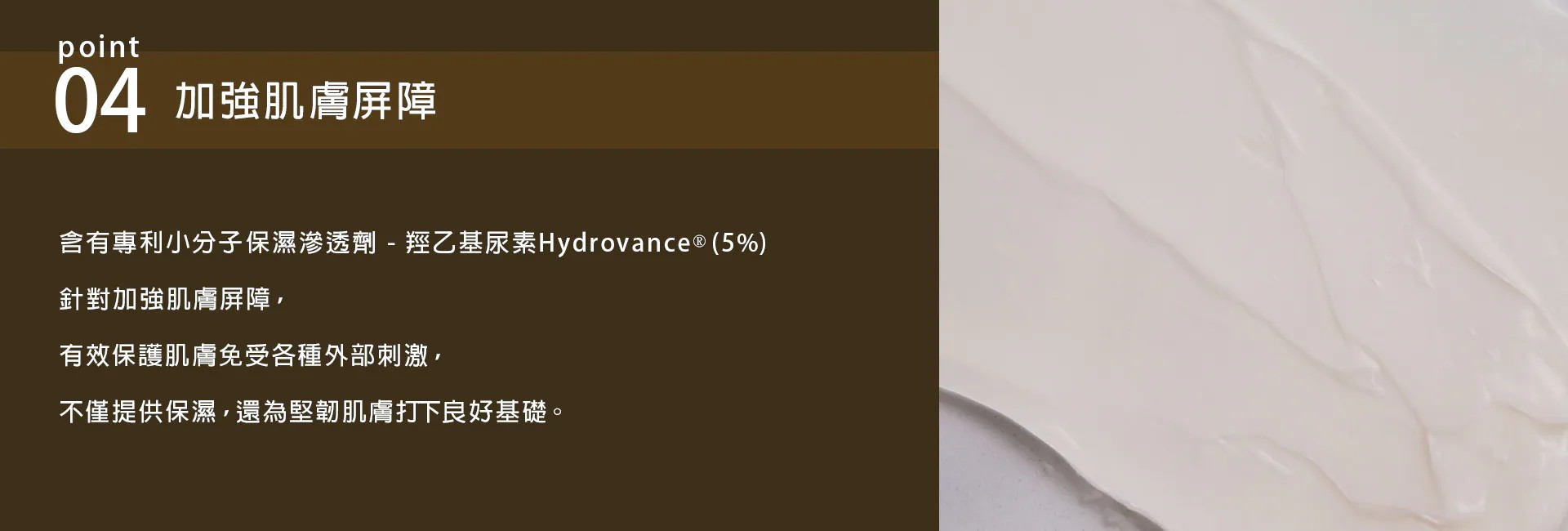 ➁ 5% Dexpanthenol 結合 5% Hydrovance®:雙重活性成分協同作用,發揮修復與補水效能,有效支持肌膚屏障,打造健康平衡的理想膚質。