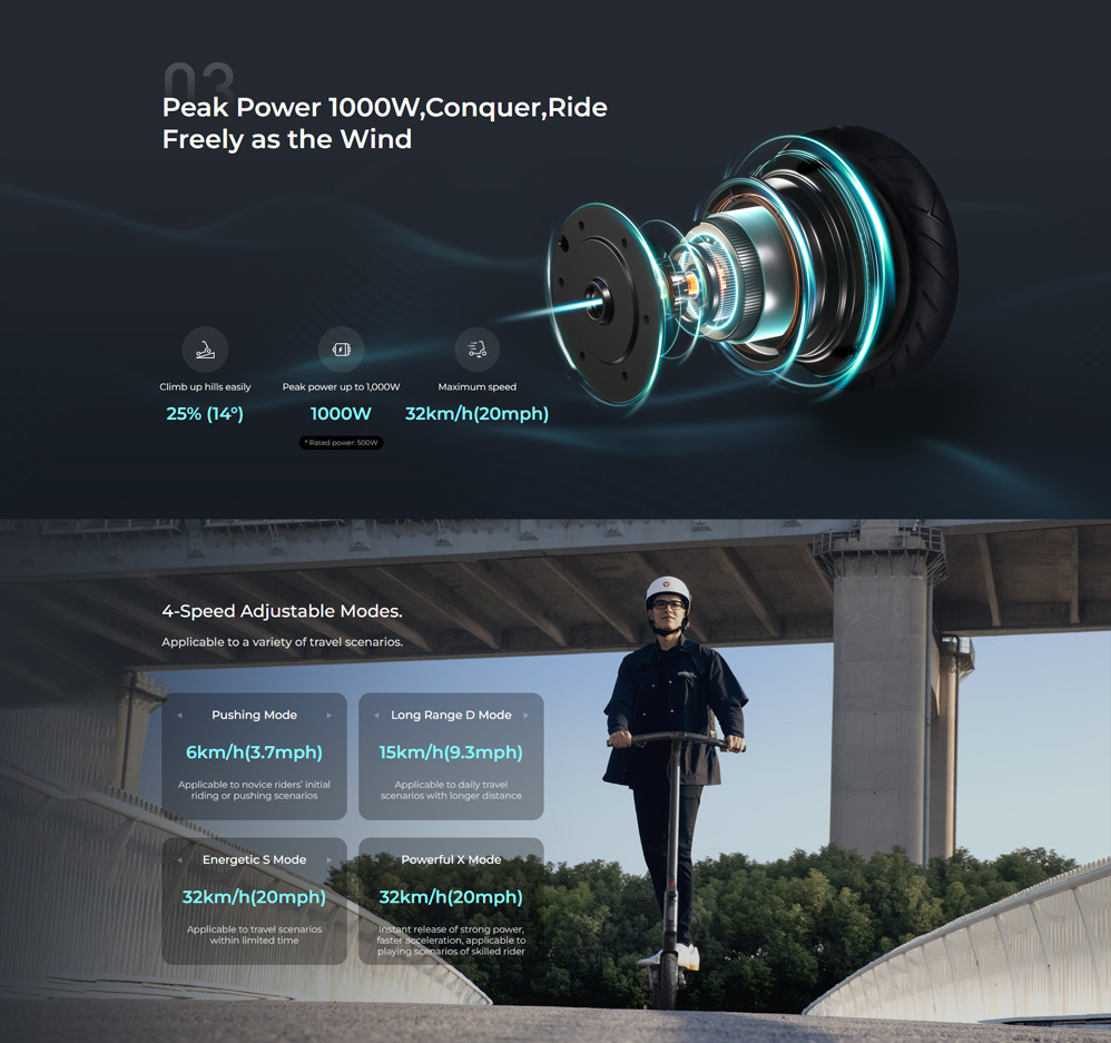 [1] D - Mode range: Tested while riding with a full battery,75kg(165 lbs)load, 25°C(77°F), at the speed of 15km/h(9.3mph) on average.
