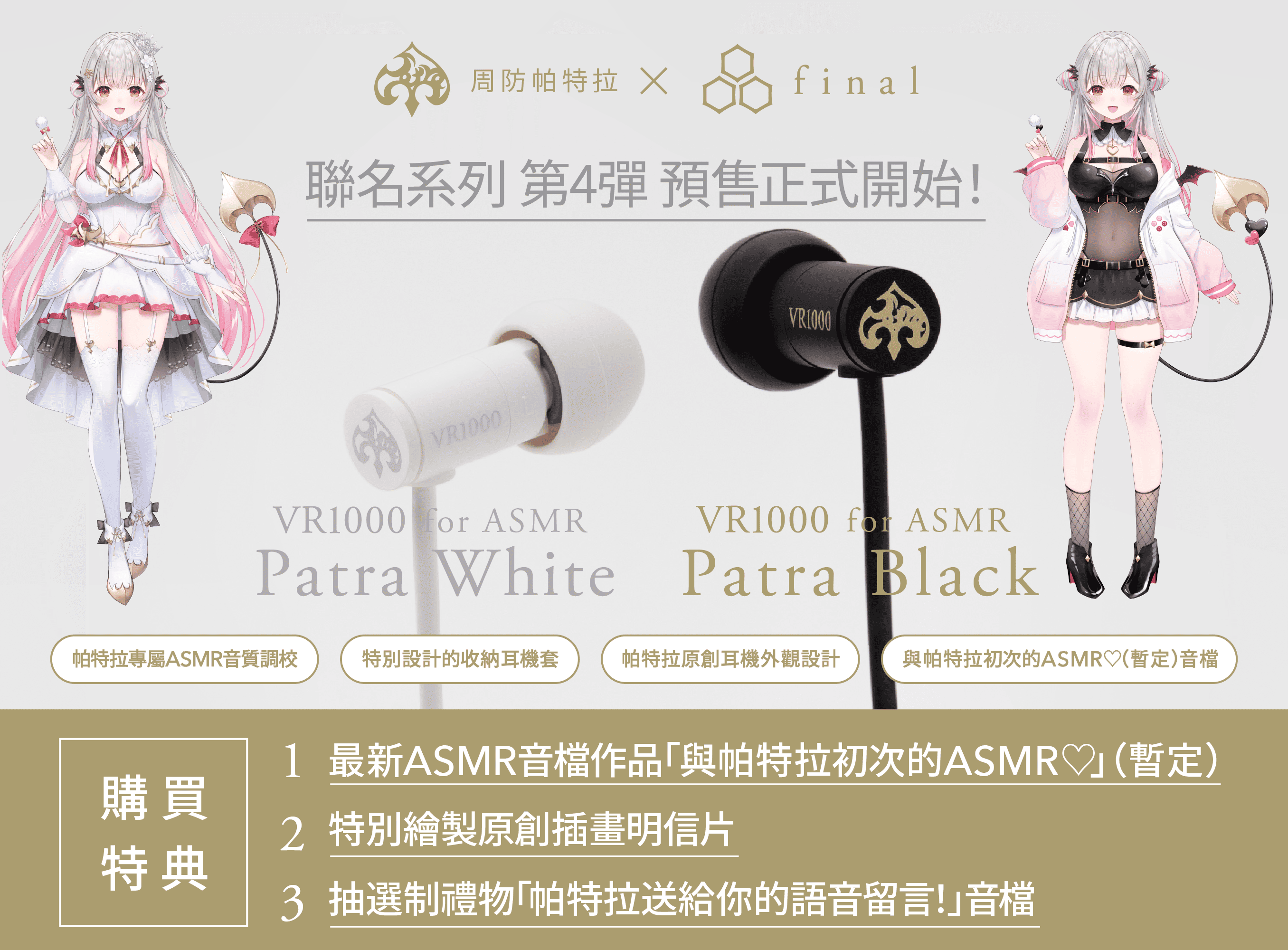 final與超人氣 VTuber「周防Patra」聯名的第4款產品,設計由帕特拉親自監修,延續前作廣受好評的風格,也是首次採用有線設計。分別具備採用白色為主、療癒天使形象的「Patra White」,和採用黑色為基調的成熟小惡魔「Patra Black」,其霧面塗裝更可以讓耳機不易沾染任何指紋。專為周防Patra ASMR 作品優化的音質設計VR1000 for ASMR融合過往設計如有線耳機「E500」與無線耳機「COTSUBU for ASMR」等ASMR的經驗,特別針對帕特拉的作品進行音質優化。加強還原呼吸時的柔和感,讓您彷彿真實感受到耳邊的氣息。柔軟舒適的「TYPE E soft」耳膠附贈耳塞採用「TYPE E soft」,比 final 定番款「TYPE E」更柔軟,長時間配戴也不易造成耳朵不適。耳塞顏色也與「Patra White」與「Patra Black」相呼應。為方便辨識尺寸,相鄰尺寸的耳塞軸色不同(灰色軸為深灰與淺灰交替,紅色軸為紅與粉交替)。共附 SS/S/M/L/LL 五種尺寸可供選擇。原創矽膠收納盒附贈的矽膠收納盒可輕鬆收納耳機線,耳機本體則以圓頂型矽膠蓋柔軟固定,輕巧便攜。盒蓋上還印有帕特拉的原創幸運草標誌。不同款式專屬包裝包裝設計由帕特拉監修,分別以「Patra White」與「Patra Black」為主題配色。背面印有帕特拉的親筆簽名印刷。【購買特典1】帕特拉訊息插畫卡&限定內容下載特別繪製的插畫卡以「Patra White」與「Patra Black」為主題,展現不同表情與色彩風格。卡片背面有帕特拉親筆訊息。 掃描卡片上的 QR Code 並輸入密碼,即可下載新錄製的「限定 ASMR 作品」與「限定插畫」。 作品標題:「與帕特拉的第一次 ASMR♡」【購買特典② 抽選400名獲得Patra小姐親自呼喚名字的語音訊息】本次合作企劃的重點活動「贈言會」將以全新形式登場。Patra小姐希望能向更多人親自表達感謝,因此特別規劃此活動。過去的贈言會吸引了來自國內外的粉絲參加,但也有不少人因距離或時間無法參與。 因此,本次將從購買並報名的顧客中抽選400名,贈送Patra小姐親自呼喚名字的專屬語音訊息。抽選對象為2025年12月31日(三)前完成訂購並填寫專屬報名表的顧客。即使身在海外,也歡迎踴躍參加!專屬報名表網址:https://form.run/@patra-personalmovie 「周防Patra × final」合作企劃歷程回顧「周防Patra × final」合作企劃歷程回顧 自2022年起展開的本次合作企劃,因廣受好評,今年已邁入第4彈。企劃的起點源自Patra小姐長期愛用ag品牌的ASMR專用無線耳機「ag COTSUBU for ASMR」,她主動提出合作產品的構想,促成了這項企劃的誕生。 第1彈:以「ag COTSUBU for ASMR」為基礎,推出Patra小姐監修的原創配色版本「ag COTSUBU for ASMR -Patra Edition-」。 第2彈:因應眾多粉絲希望再販的聲音,推出帶有成熟氛圍的「ag COTSUBU for ASMR Patra Edition -BLACK Ver.-」。 第3彈:採用final新型號,具備超小型機身與一體式柔軟耳塞,實現舒適配戴感的「final ZE500 for ASMR -Patra Black/Patra White-」。 第4彈:根據粉絲回饋,首次推出有線耳機型號「final VR1000 for ASMR Patra White/Patra Black」。