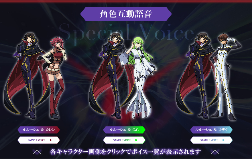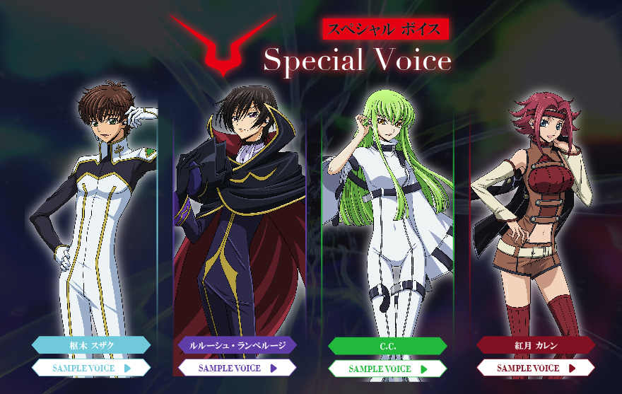 包含超過 150 種全新語音,包括可讓您欣賞作品中名句的特殊語音。除了作品中出現的 4 位角色; 樞木朱雀、魯路修·蘭佩洛基、C.C.、紅月卡蓮的獨奏模式外,還有 3 種可以享受魯路修與各角色互動的模式,總共 7 種模式。每種模式都可以使用應用程式進行切換,單人模式,按一下每個角色圖像可顯示聲音列表。