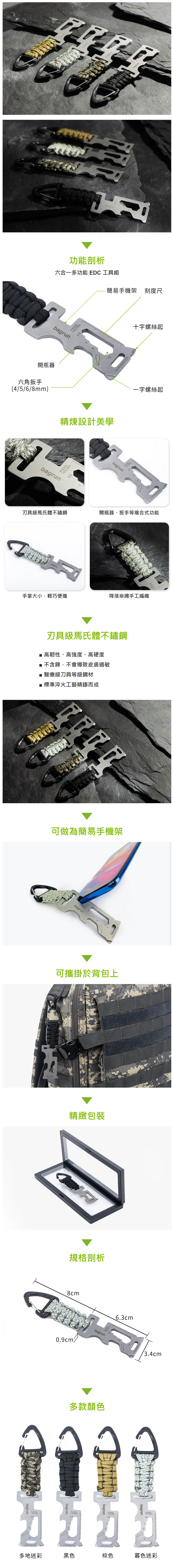 六合一多功能 EDC 工具組,包括簡易手機架、刻度尺、十字螺絲器、一字螺絲器、開瓶器及六角扳手。