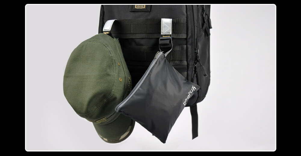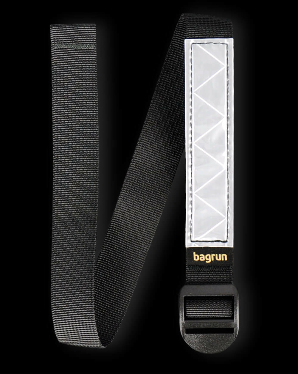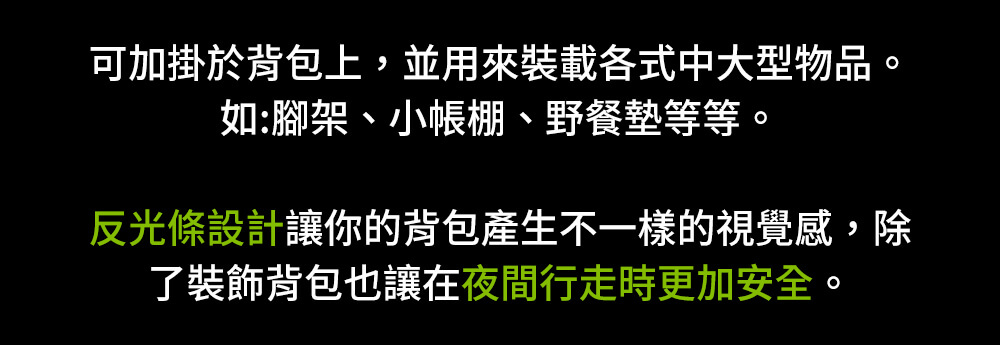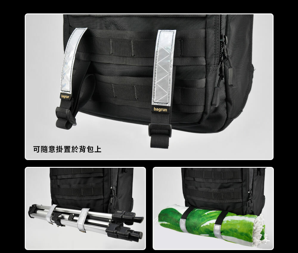 反光置物帶可掛於背包上,並用來裝載各式中大型物品。如腳架、小帳棚、野餐墊等等。