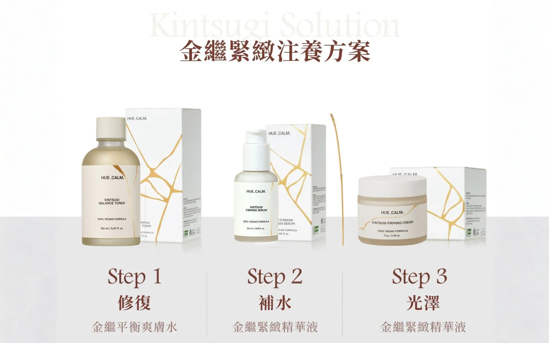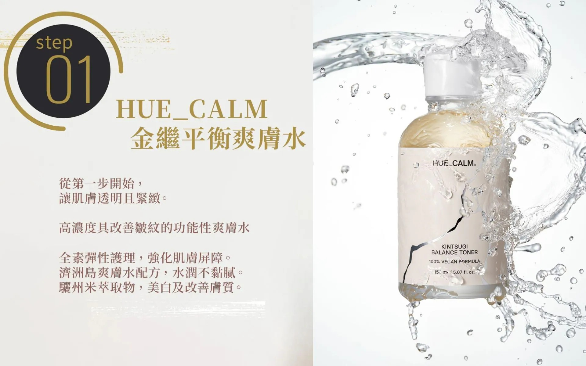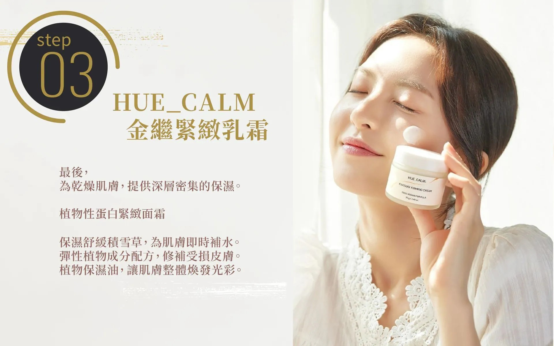 HUE_CALM 金繼平衡爽膚水 → HUE_CALM 金繼緊緻精華液 → HUE_CALM金繼緊緻乳霜