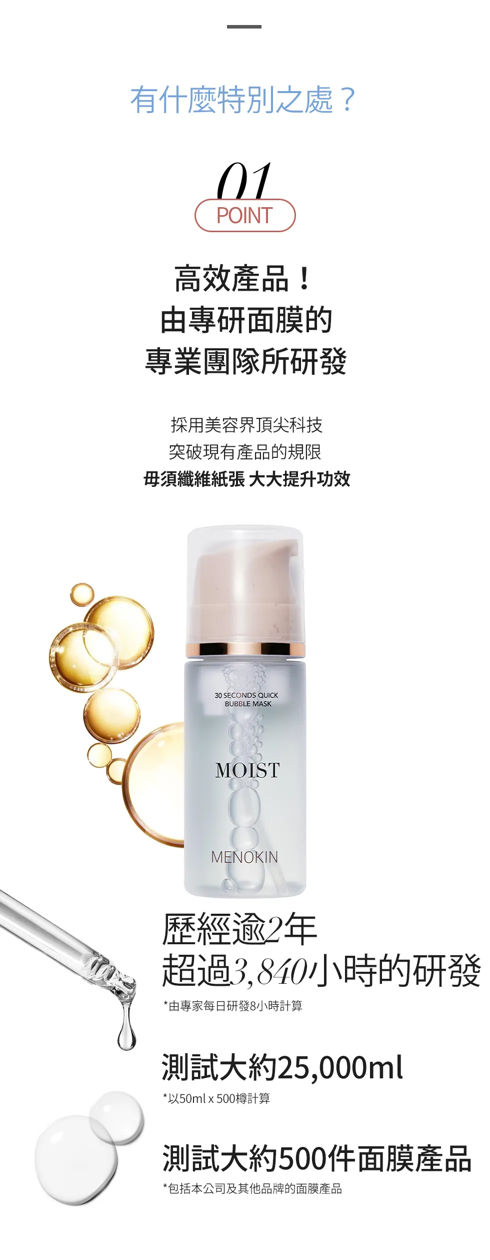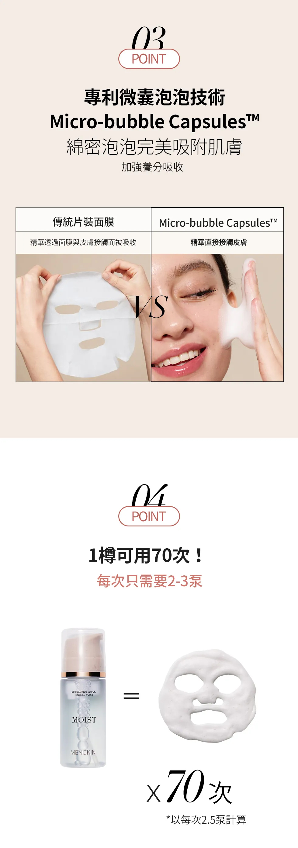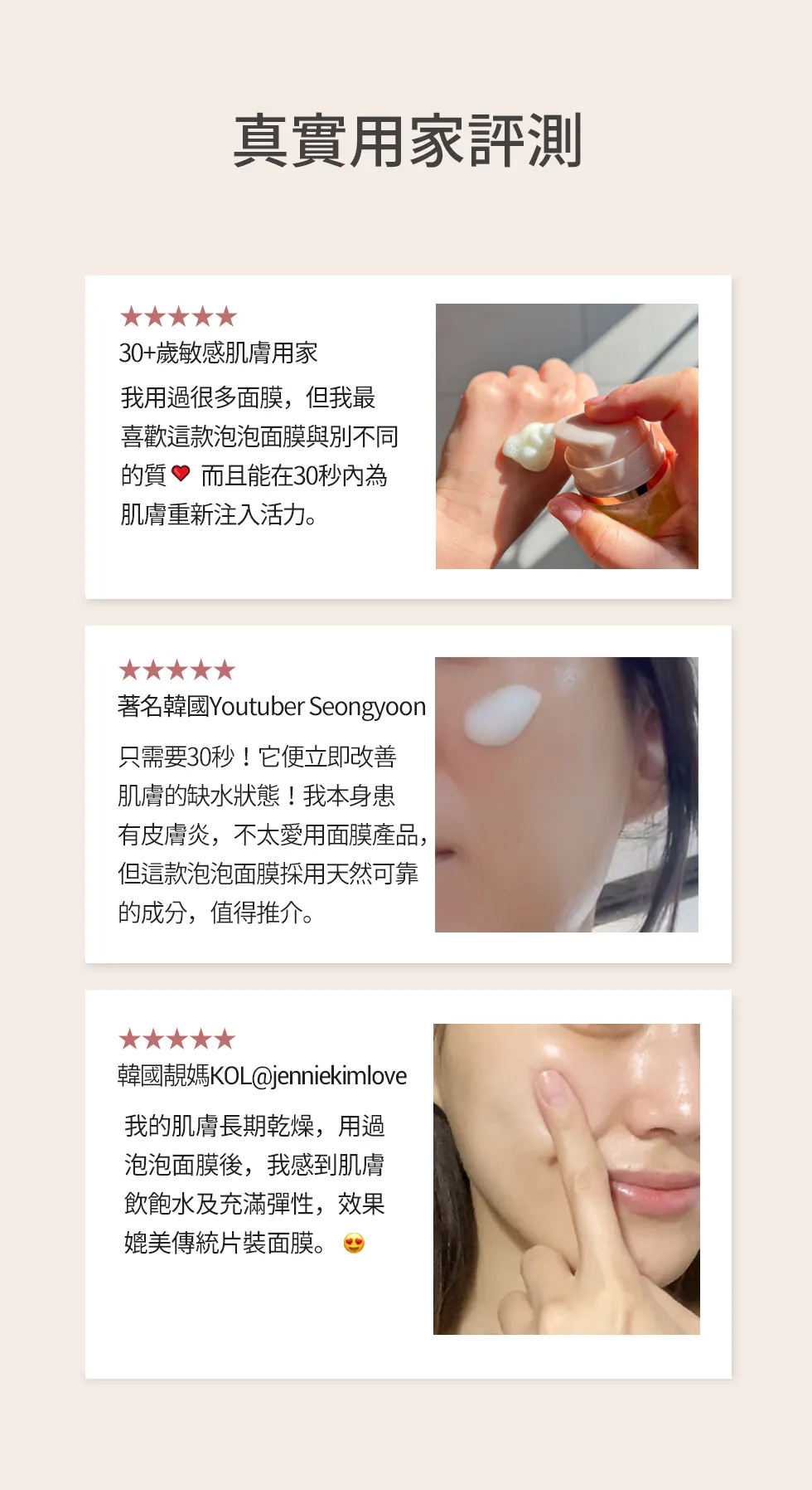 第一步: 取出2-3泵30秒免洗泡泡面膜第二步: 塗抹全臉,輕輕按摩第三步: 等待30秒直至完全吸收
